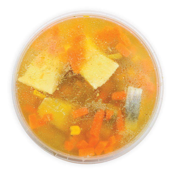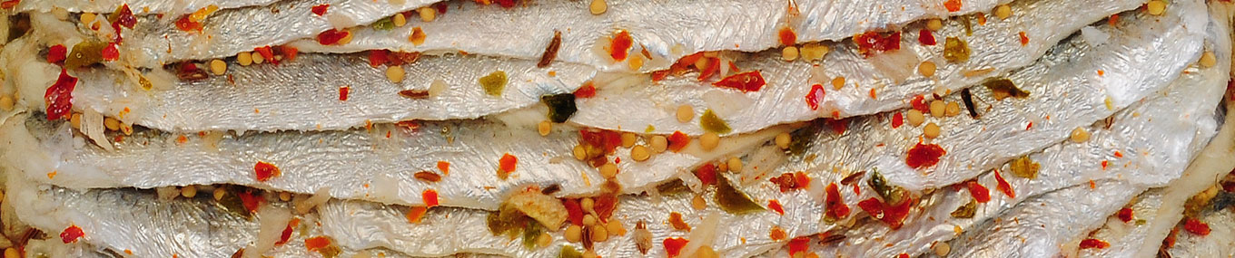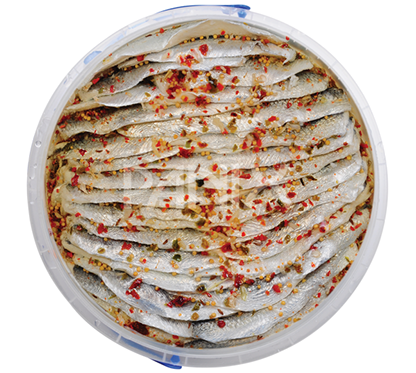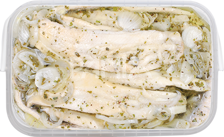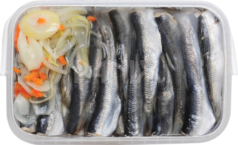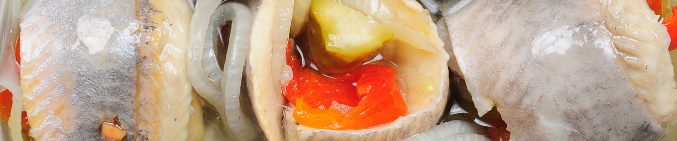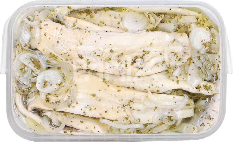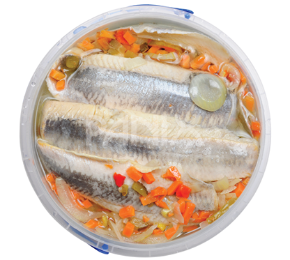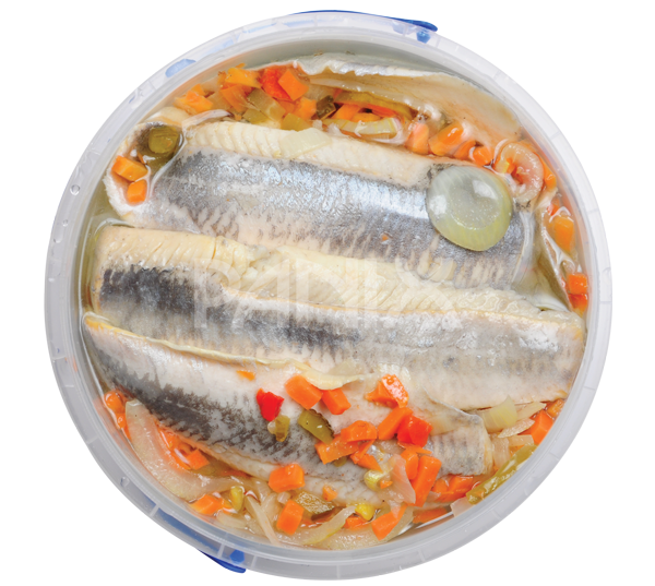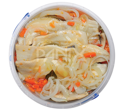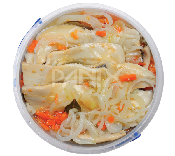Filet śledziowy marynowany, bez skóry, o wyraźnym smaku uzyskanym dzięki obecności czosnku i czarnego młotkowanego pieprzu, z dodatkiem ogórka, cebuli, papryki, marchwi;