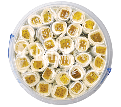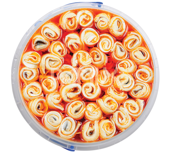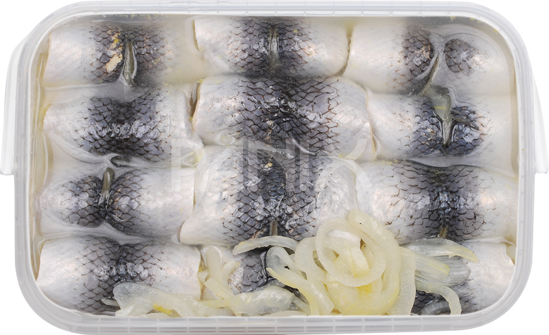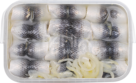 Filet śledziowy marynowany, bez skóry, zwijany ze smażoną cebulą z dodatkiem koncentratu pomidorowego i przypraw;