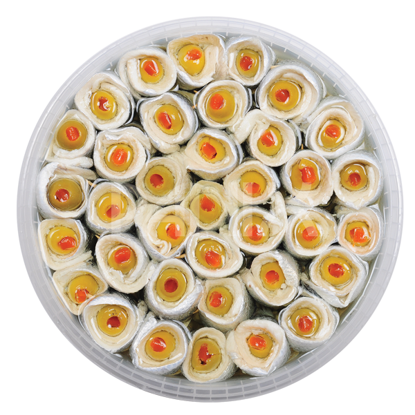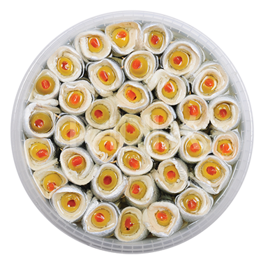 Mini fileciki śledziowe marynowane, zwijane w ślimaczki z zieloną oliwką nadziewaną pastą paprykową; w oleju rzepakowym.