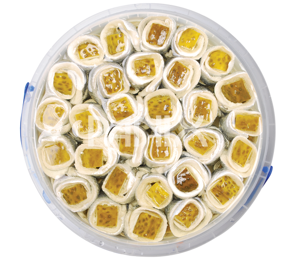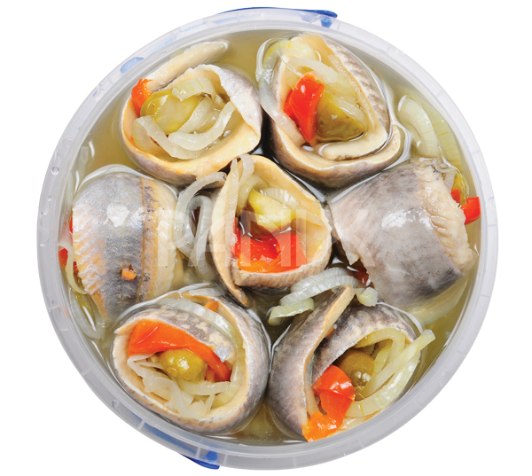 Płat marynowany ze skórą, zwinięty z ogórkiem (opcjonalnie: cebulą, papryką); w delikatnej zalewie octowej (lub w oleju rzepakowym)