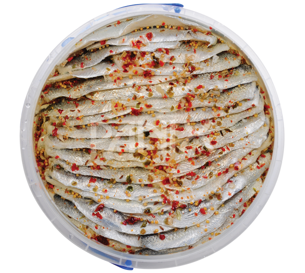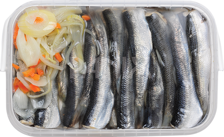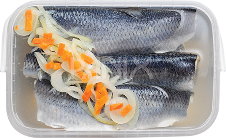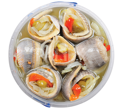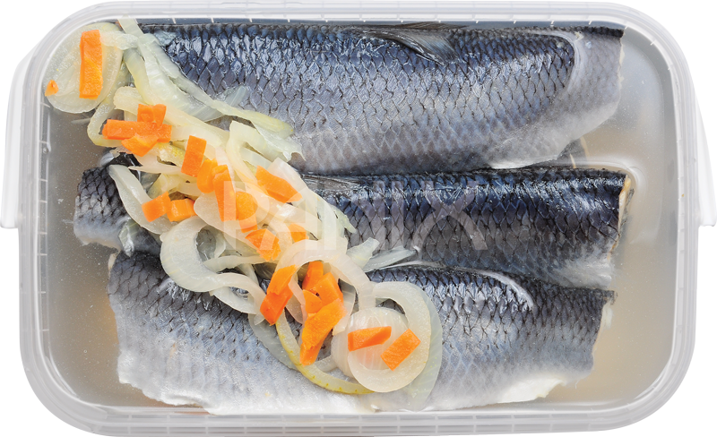 Filet śledziowy marynowany, bez skóry, o wyraźnym smaku uzyskanym dzięki obecności czosnku i czarnego młotkowanego pieprzu, z dodatkiem ogórka, cebuli, papryki, marchwi;