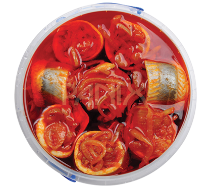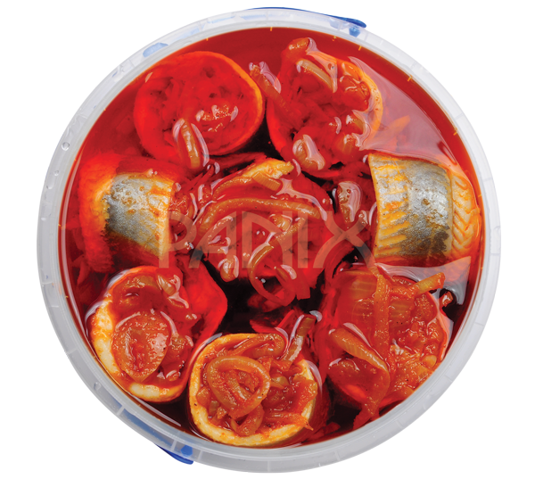 Filet śledziowy marynowany, bez skóry, zwijany ze smażoną cebulą z dodatkiem koncentratu pomidorowego i przypraw;