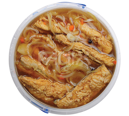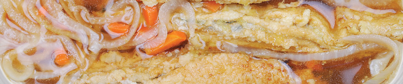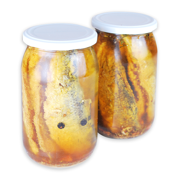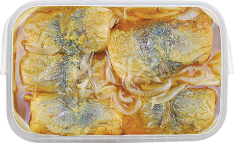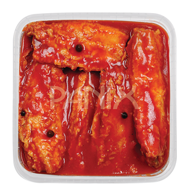 Płat śledziowy panierowany i smażony; w aromatycznym sosie pomidorowym własnej produkcji.